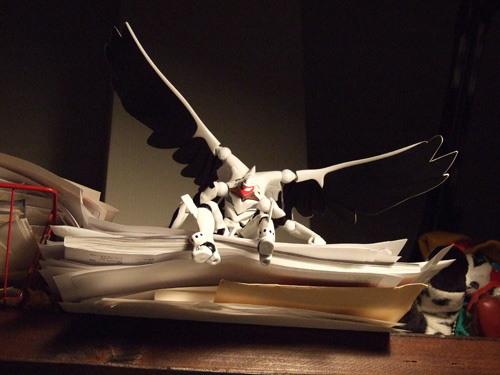 コレ、モニタの上の書類の山の上に座っておられまつ。